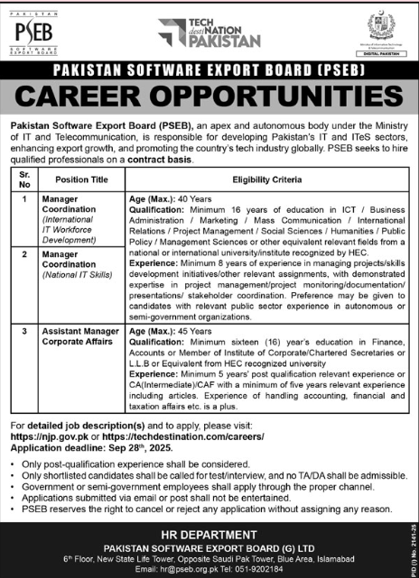 Only male candidates can apply for Pakistan Software Export Board Jobs In Islamabad September 2025Qualification /Experience Required:Qualification: Minimum 16 years of education in ICT Business Administration Marketing Mass Communication International Relations/Project Management / Social Sciences / Humanities / Public Policy/Management Sciences or other equivalent relevant fields from a national or international university/institute recognized by HEC and more experienced candidates should apply before 28 September 2025.