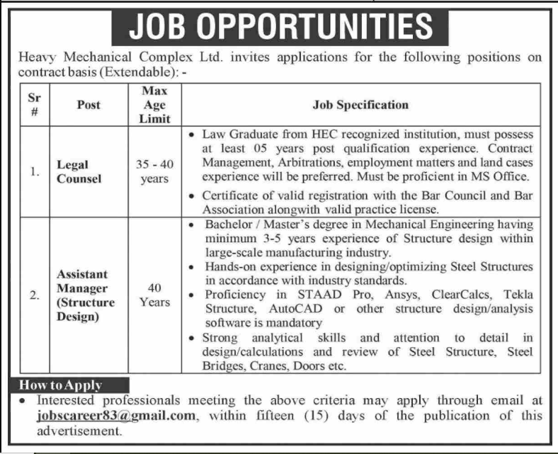 Candidates if you are seeking Heavy Mechanical Complex Ltd Jobs In Lahore September 2025 if yes. It would be best if you tried to complete read Heavy Mechanical Complex Ltd Jobs In Lahore September 2025job because you can easily apply for these vacancies Legal Counsel Assistant Manager (Structure Design).