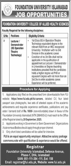 Only male candidates can apply for Foundation University Jobs In Islamabad September 2025Qualification /Experience Required: 1st Class BS in Operation Theatre Technology equivalent degree in the relevant field from an HEC recognized University/Institution with no 3rd Division in the academic career Condition of no 3rd Div shall not be applicable in the qualification of appointment as Lecturer/Demonstrator in Universities or Degree Awarding, and more experienced candidates should apply before 20 September 2025.