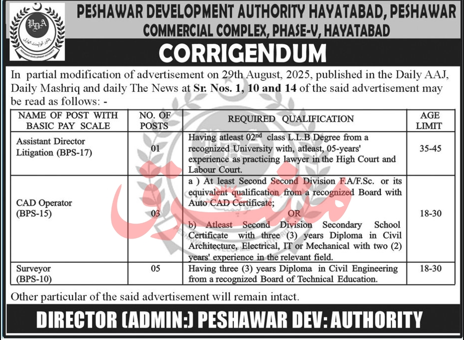 Only Male candidates can apply for this Peshawar Development Authority Hayatabad Jobs September 2025 Qualification /Experience Required: Having atleast 02nd class L.L.B Degree from a recognized University with, atleast, 05-years’ experience as practicing lawyer in the High Court and Labour Court. At least Second Second Division F.A/F.Sc. or its equivalent qualification from a recognized Board with Auto CAD Certificate; Atleast Second Division Secondary School Certificate with three (3) years Diploma in Civil Architecture, Electrical, IT or Mechanical with two (2) years’ experience in the relevant field. Having three (3) years Diploma in Civil Engineering from a recognized Board of Technical Education, and more experienced candidates should apply before 21 September 2025.