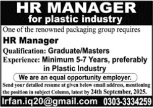 in Plastic Industry, and more experienced candidates should apply before 24 September 2025.