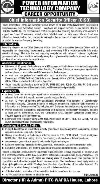 Candidates if you are seeking the Power Information Technology Company Wapda Lahore Jobs September 2025 if yes. It would be best if you tried to complete read this Power Information Technology Company job because you can easily apply for these vacancies Chief Information Security Officer (CISO).