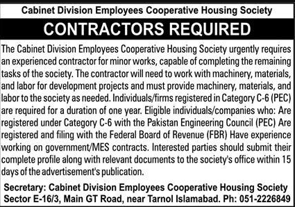 Only male candidates can apply for Cabinet Cooperative Housing Society Jobs In Islamabad, September 2025Qualification /Experience Required: Labor to the society as needed. Individuals/firms registered in Category C-6 (PEC) are required for a duration of one year. Eligible individuals/companies who: Are registered under Category C-6 with the Pakistan Engineering Council (PEC) Are registered and filing with the Federal Board of Revenue (FBR) Have experience working on government/MES contracts. Interested parties should submit their complete profile along with relevant documents to the society’s office within 15 days of the advertisement’s publication, and more experienced candidates should apply before 30 September 2025.