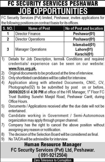 Candidates if you are seekingFC Security Service Ltd Jobs In Peshawar September 2025 if yes. It would be best if you tried to complete read FC Security Service Ltd job because you can easily apply for these vacancies Director Finance Director Operations Operations Manager.